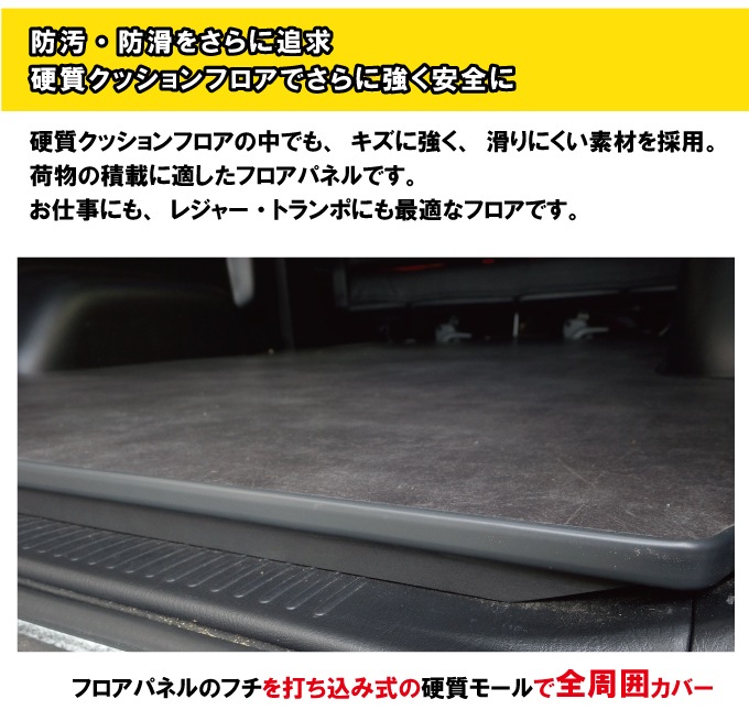 ※ベッドキットの取り付けには必須となります店舗や屋外の床材にも使用される高耐久の硬質クッションフロアで、ハードユースに対応。2列目シートから後ろの床を、フラットにカバーします。