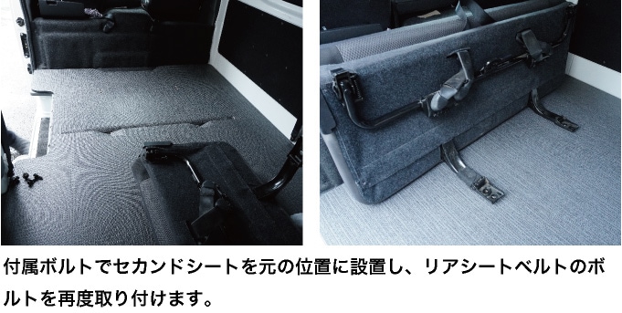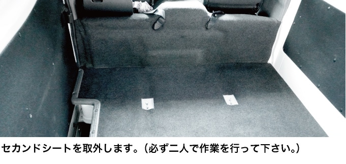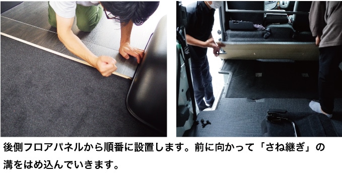 総全長、約2810mmのフルサイズ。 運転席の後ろからすべての床面を完全カバーリングします。セカンドシートを一旦取外しフロアパネルをはめ込みで敷いていくので、段差が解消され美しい床面に仕上げることができます。